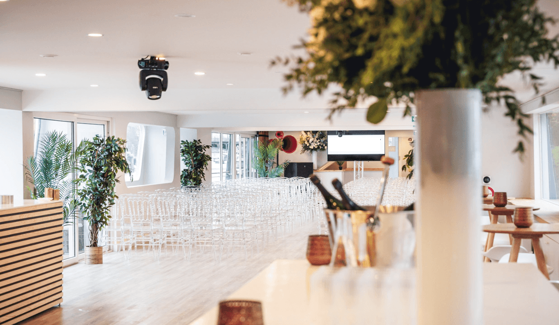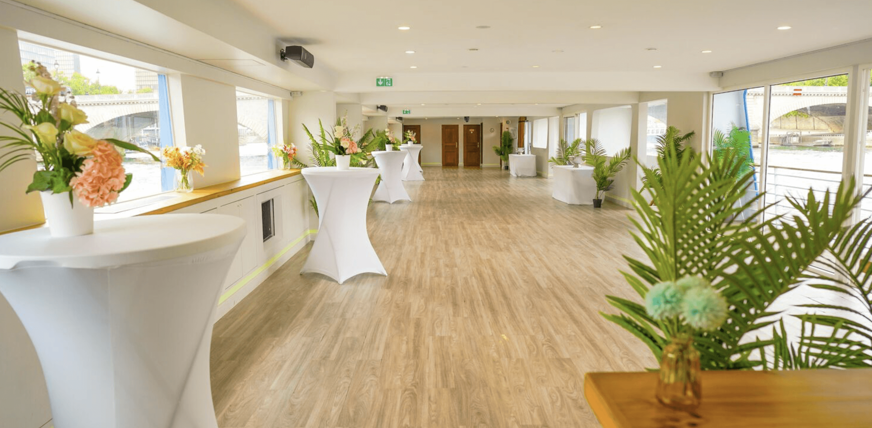 Surplombant la capitale, cet espace de 288 m² se déploie en une terrasse généreuse aux matériaux boisés, qui évoluent au fil des saisons. Elle offre une vue imprenable sur les monuments emblématiques de Paris tout au long de la croisière. Vos invités pourront également admirer le spectacle de la surprenante fontaine située en aval de la péniche. Dès la nuit tombée, les jeux de lumière mettent en valeur l’architecture parisienne, créant un tableau d’une rare beauté.