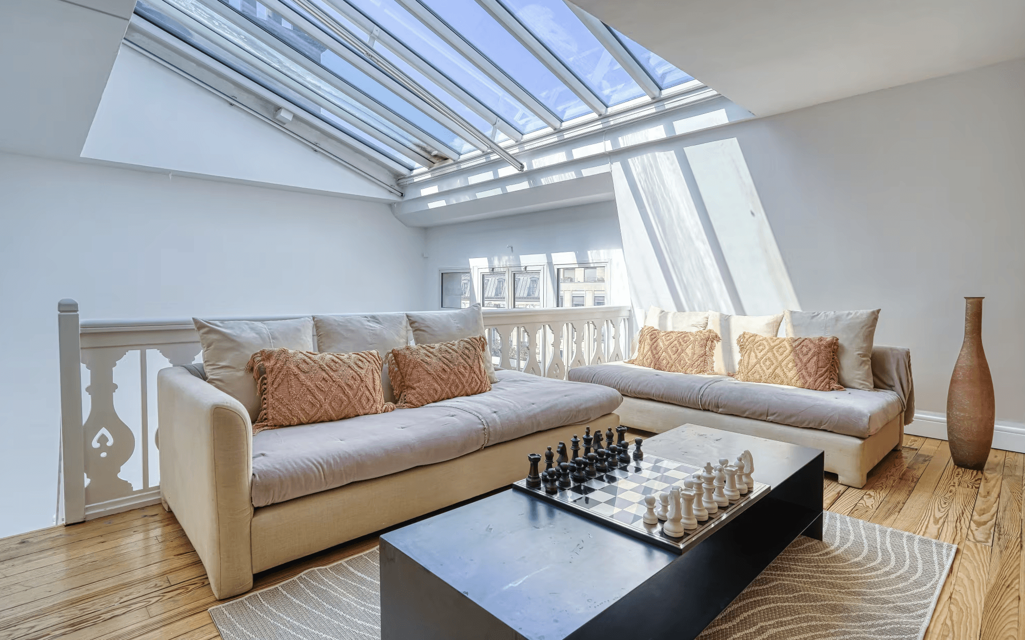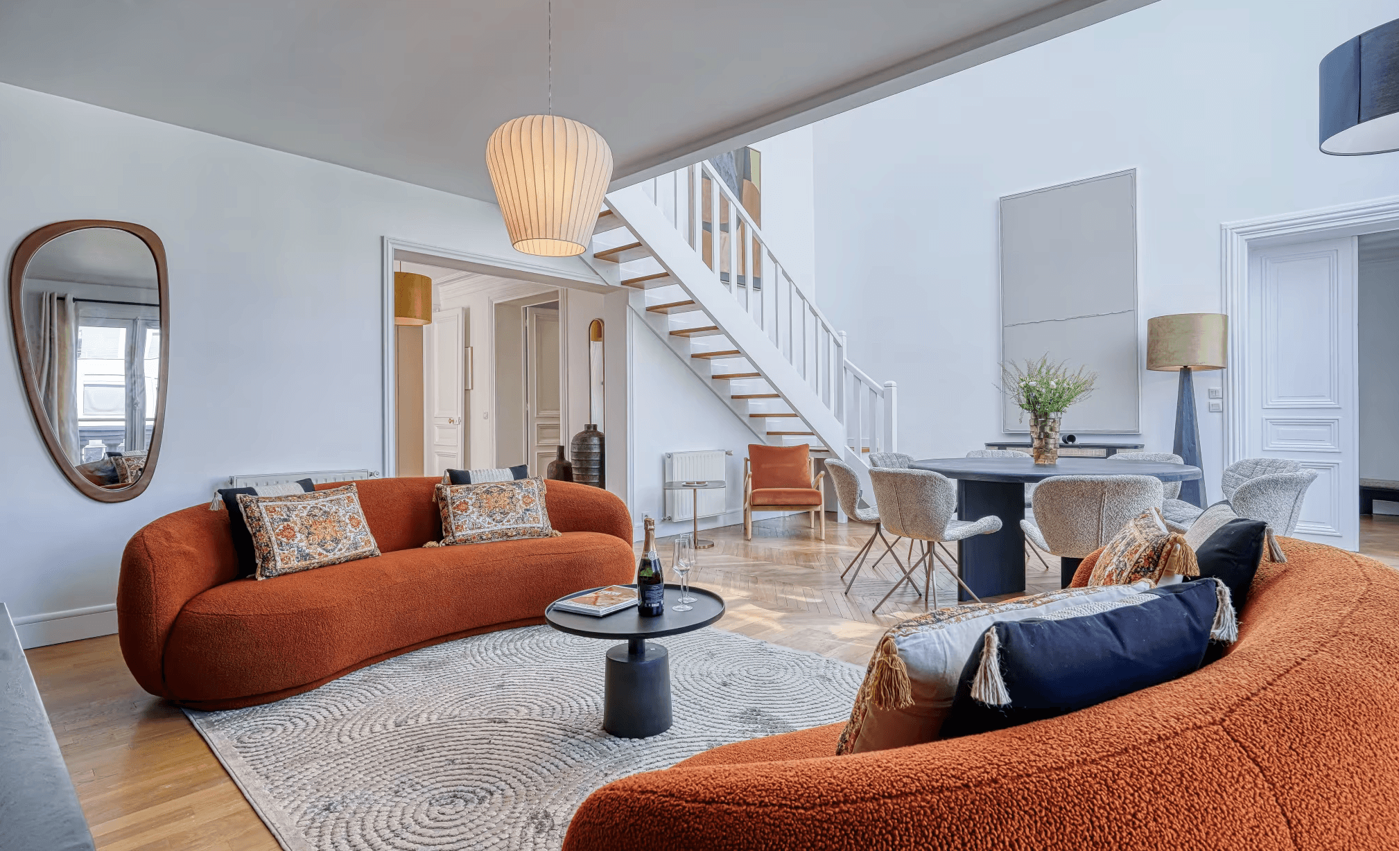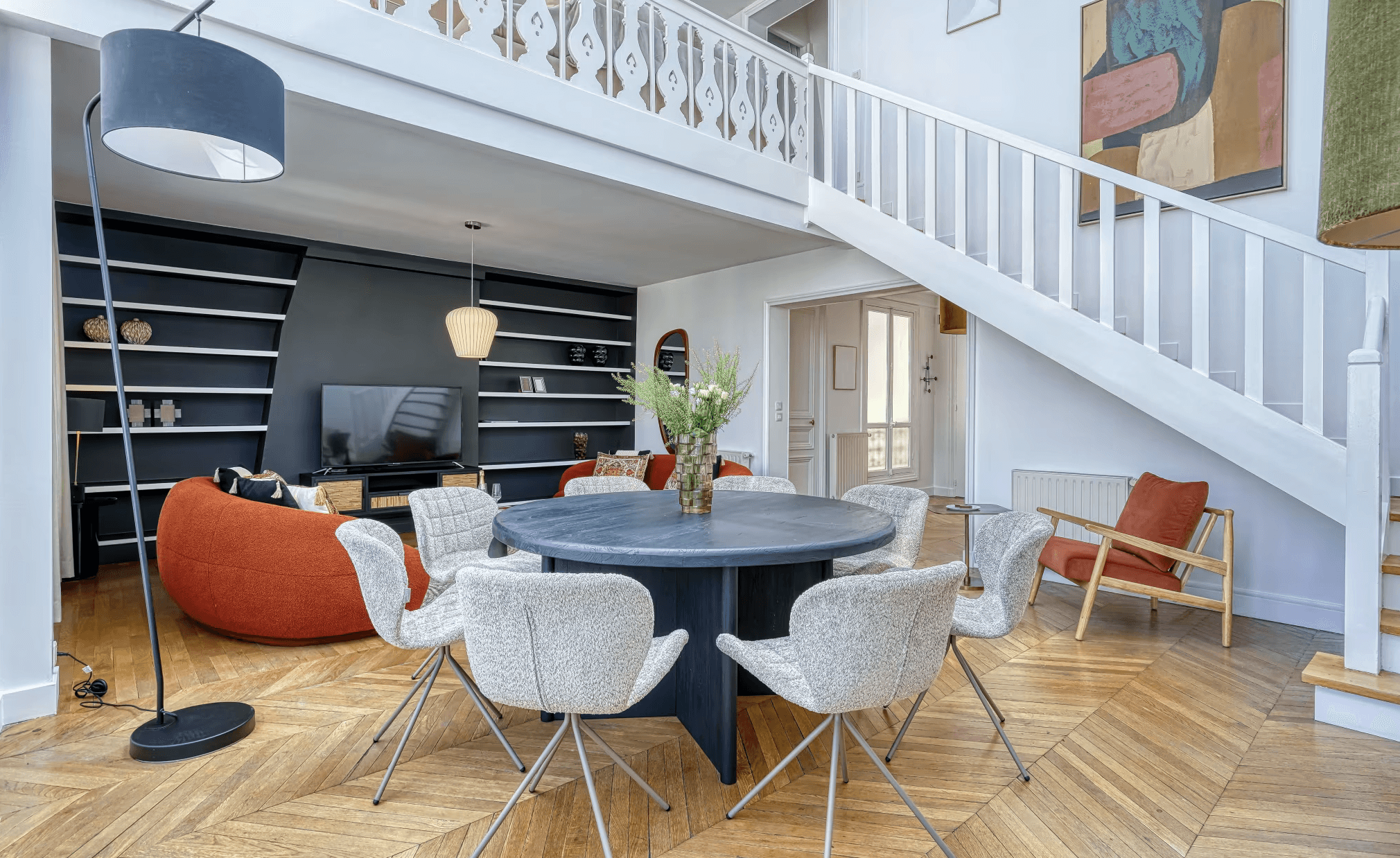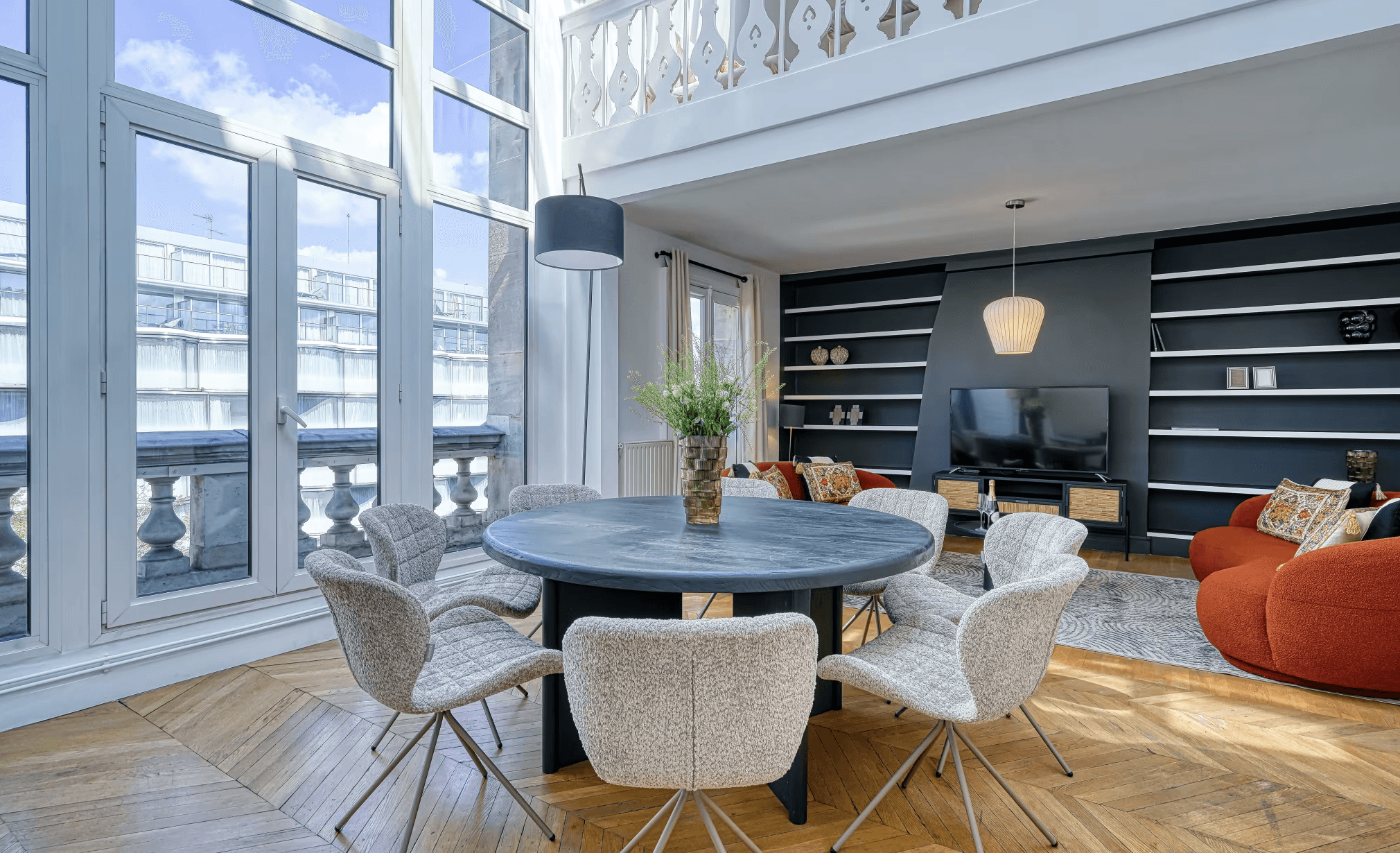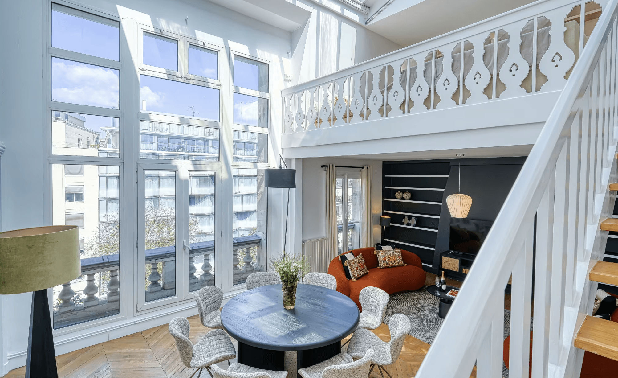 Vous apprécierez tout particulièrement l’attention portée aux moindres détails ainsi que le mobilier élégant. Les grandes fenêtres offrent des vues panoramiques sur la ville, et le chaleureux espace mezzanine constitue un lieu idéal pour se détendre et partager de beaux souvenirs. La salle à manger est parfaite pour savourer un petit-déjeuner parisien ou pour mettre en pratique vos talents culinaires français.